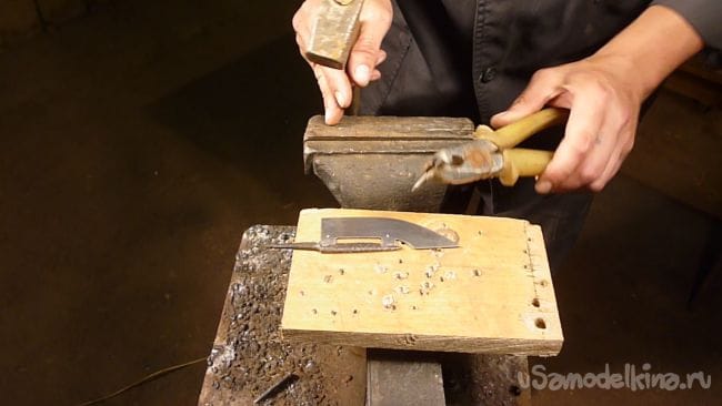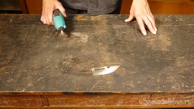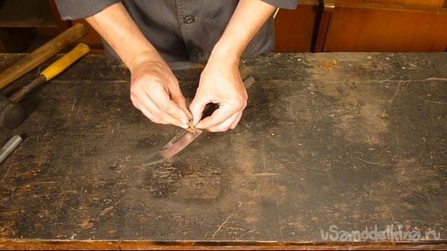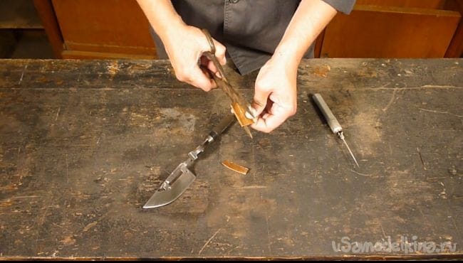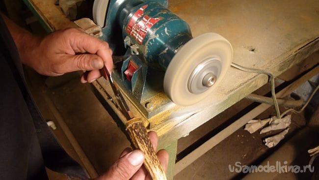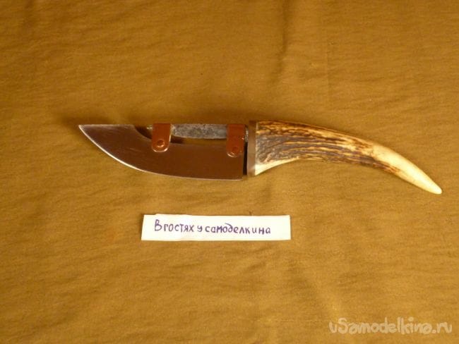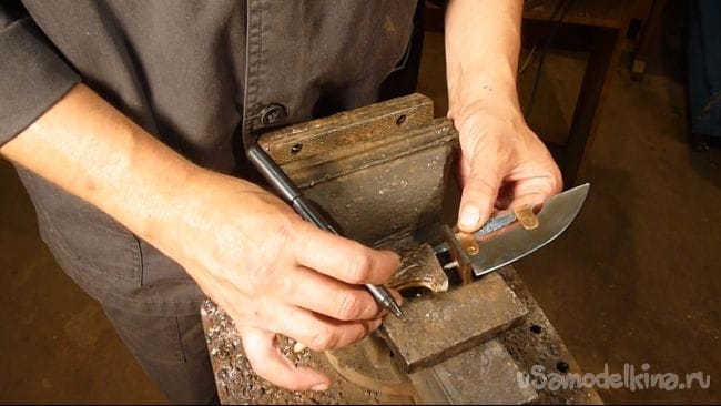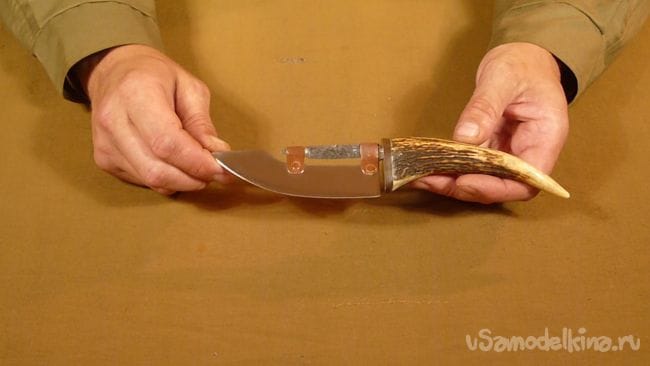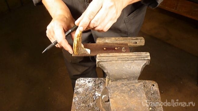 В роге и текстолите просверлили отверстие для хвостовика клинка и грубо подогнали детали друг к другу.