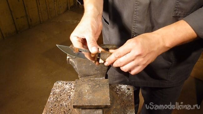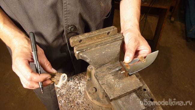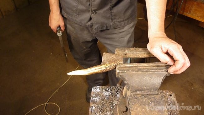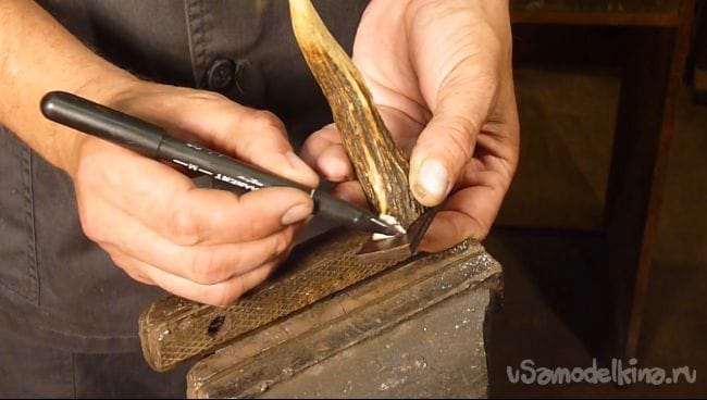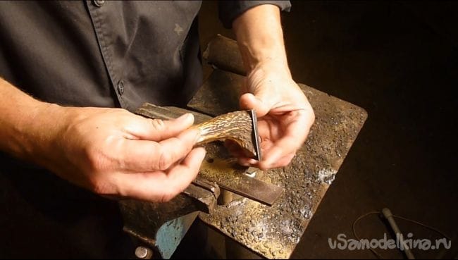 В мастерской нашелся остаток рога, практически идеально подходящий по форме под клинок. Отпилили нужный размер ножовкой по металлу.