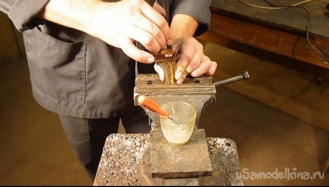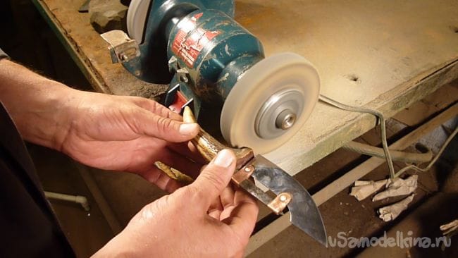 После затвердевания смолы доработали рукоять на заточном станке. Запах конечно не из приятных.