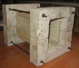Предлагаю «сухой» способ изготовления муфеля не требующий специального оборудования или навыков керамиста. Основная часть муфеля, представляет собой коробку из двух П-образных частей, каждая из которых выпилена из огнеупорного (шамотного) кирпича. Толщина стенки – около 10 мм. Преимущества способа очевидны – шамотный кирпич – фабричным способом выполненный огнеупор, прессованный, обожженный, все как положено по уставу. Теплопроводность шамота изрядная – много выше обычного глиняного кирпича, именно поэтому из него запрещено складывать печи – внешние стенки быстро и сильно разогреваются, печь становится пожароопасной. Шамот в отопительных дровяных печах применяется только для футеровки.