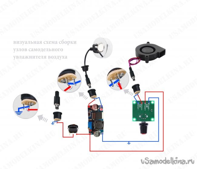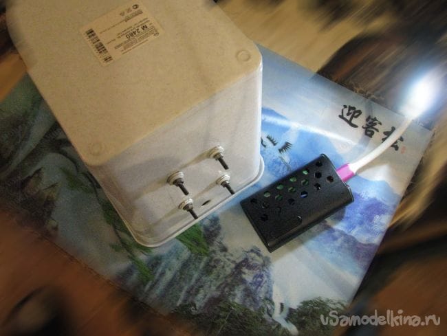 - к одному и тому же гнезду (через выключатель), подключен повышающий до 22В модуль, напряжение с которого подается на генератор тумана;