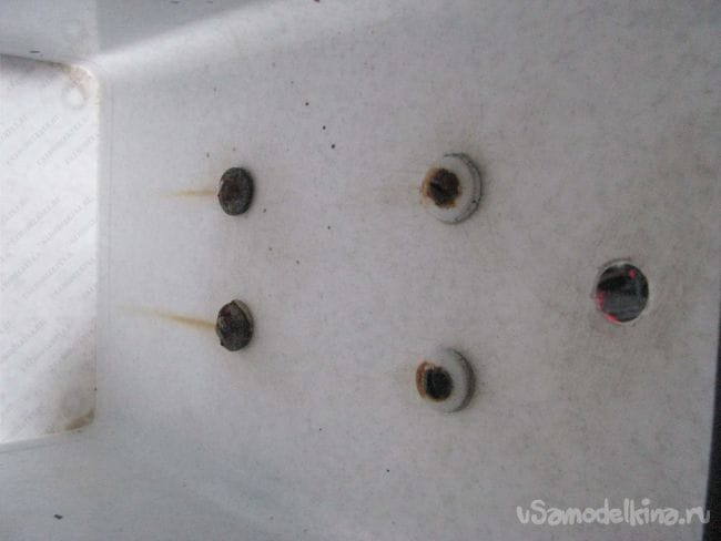 С обратной стороны этого винтового крепежа видны потеки ржавчины, так как я торопился, а потом мне было лень, и если бы не авария, всё так бы и осталось. Но теперь мне пришлось смочить ржавчину пищевой лимонкой и после чистки-сушки герметизировать головки винтов клеем из акрилата.