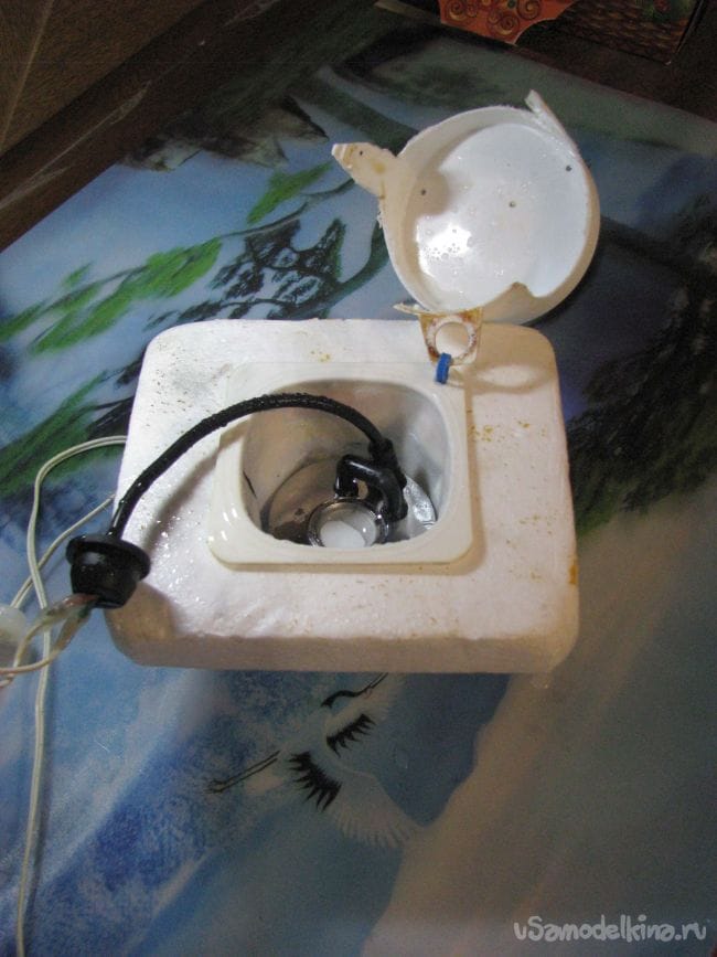 В офисное ведро была залита пропущенная через кувшинный фильтр вода, через отверстие вверху ведра был просунут штекер и вдавлена пробка от флакона из-под антибиотика в центре которой был пропущен шнур ведущий к генератору тумана. Поплавок был опущен на поверхность.
