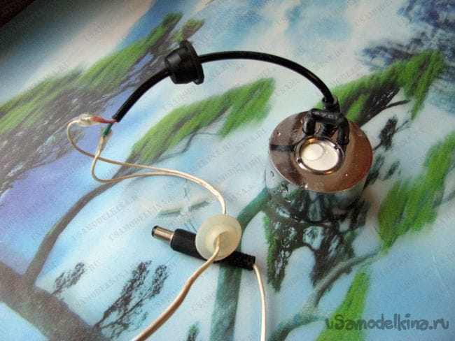 Подберите пробку от флакона с антибиотиками, и перед сращиванием проводов, или при припаивании штекера с другой стороны - неважно, - пропустите провод через центр пробки. Она будет вставлена в соответствующее отверстие в офисной корзине. Как всегда, герметизируйте места спайки горячим клеем.