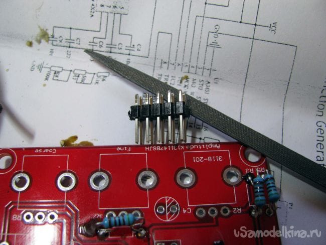 Место для нее находится правее неполярных конденсаторов. Зачистите надфилем штырьки с той стороны гребенки, где они короткие. Не поленитесь, иначе, пайка гребенки превратится в ад.