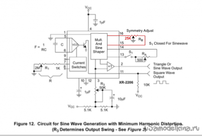 В нашем генераторе, выводы микросхемы 15 и 16 висят в воздухе, т.е. не используются. Подключив к ним подстроечный резистор номиналом 25 кОм, а средним лепестком на минус, у нас появится возможность нивелировать искажения при генерации синусоидального сигнала. Это, конечно имеет смысл, так как, для меня это прежде всего генератор звука.