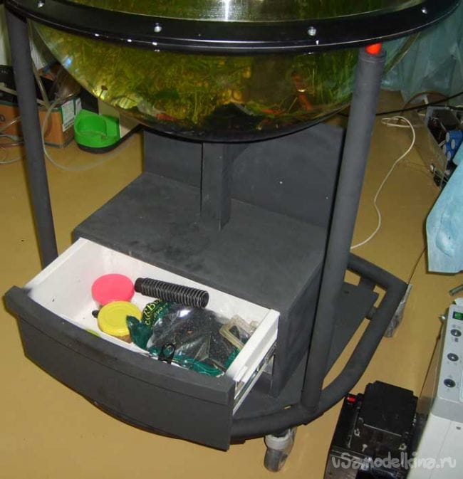 Из горы поломанной мебели набрал листов ДСП и за пару часов напилил, и собрал на саморезах ящик для корма, сачка и прочих причиндал. Шляпки шурупов были зашпаклеваны и весь ящик покрашен черной матовой акриловой краской из баллончика. По центру пришлось установить опору из бруска 50х50мм, чтобы полушарие из оргстекла не выдавило весом воды и грунта (примерно 150кг).