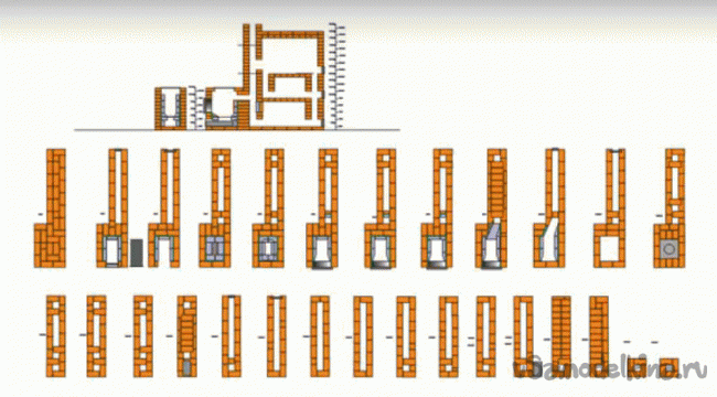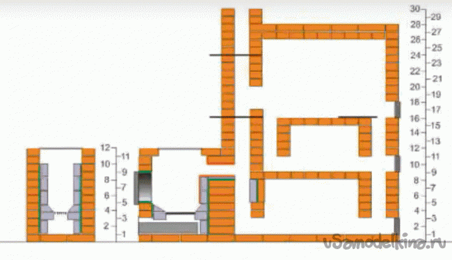 На 16 ряду сомнительное место – задвижка внутри, открывающаяся через прочистную дверку. Это позволило сосредоточить оба печных прибора в одном ряду. Мы сразу не сообразили и сделали по порядовке, однако, можно было выполнить это место и более традиционно – например, перенести задвижку на боковую сторону. К слову – она переключает место преимущественного нагрева – в закрытом состоянии, он в основном нижний, в открытом – прогревается и верх. Нам показалось, что частота пользования этой задвижкой будет крайне невелика.