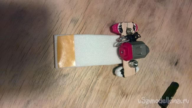 Закрепляем на двухсторонний скотч винтики так чтобы робот ехал прямо
