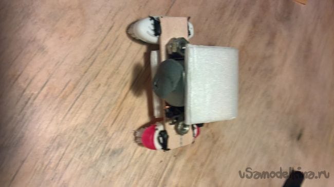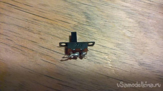 Теперь припаеваем один конец батарейки нарямую к двигателю а другой через выключатель на двигатель