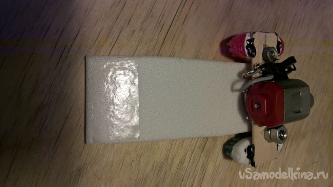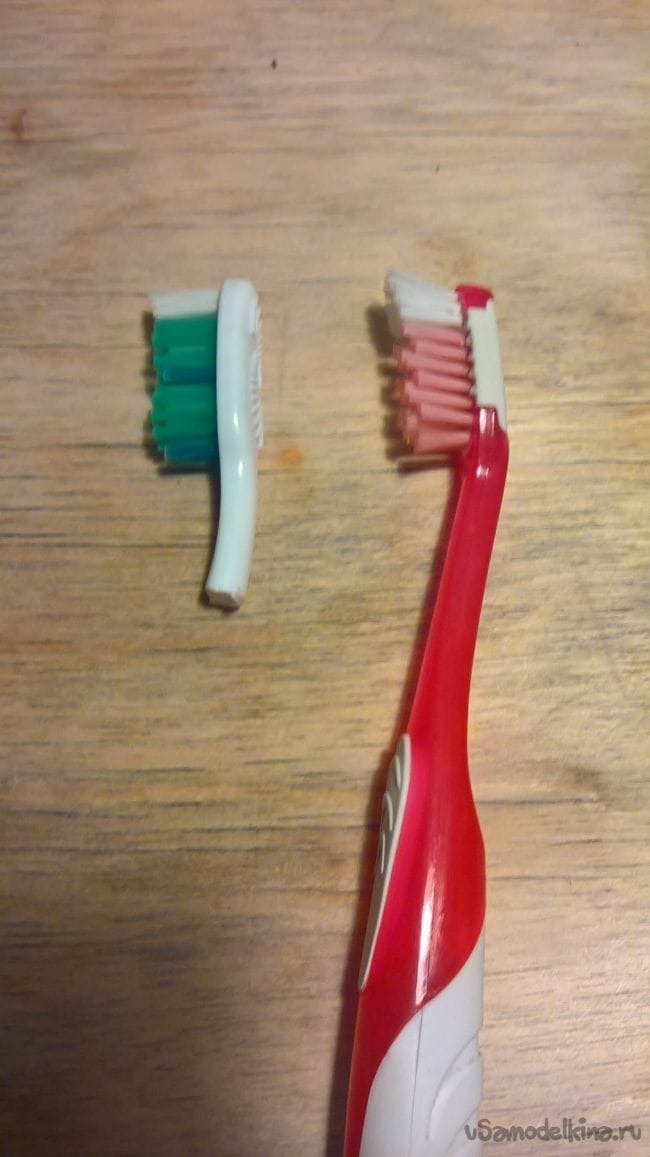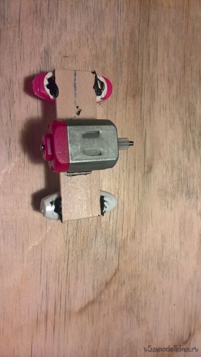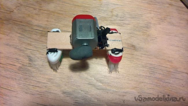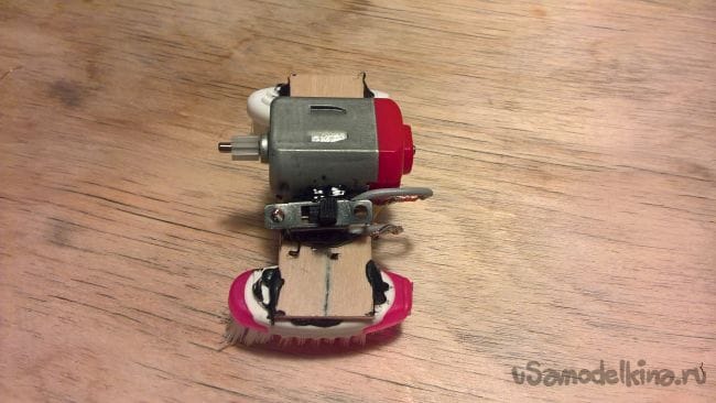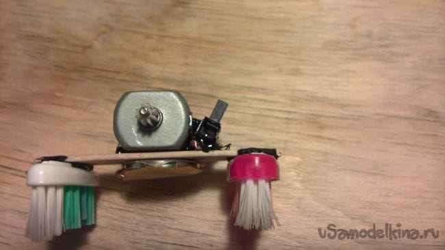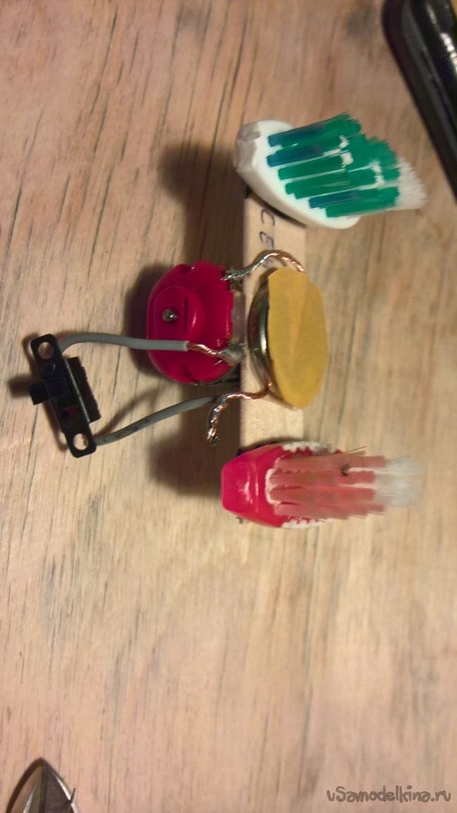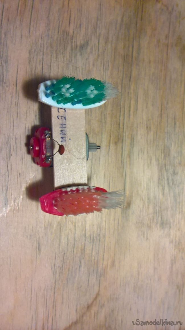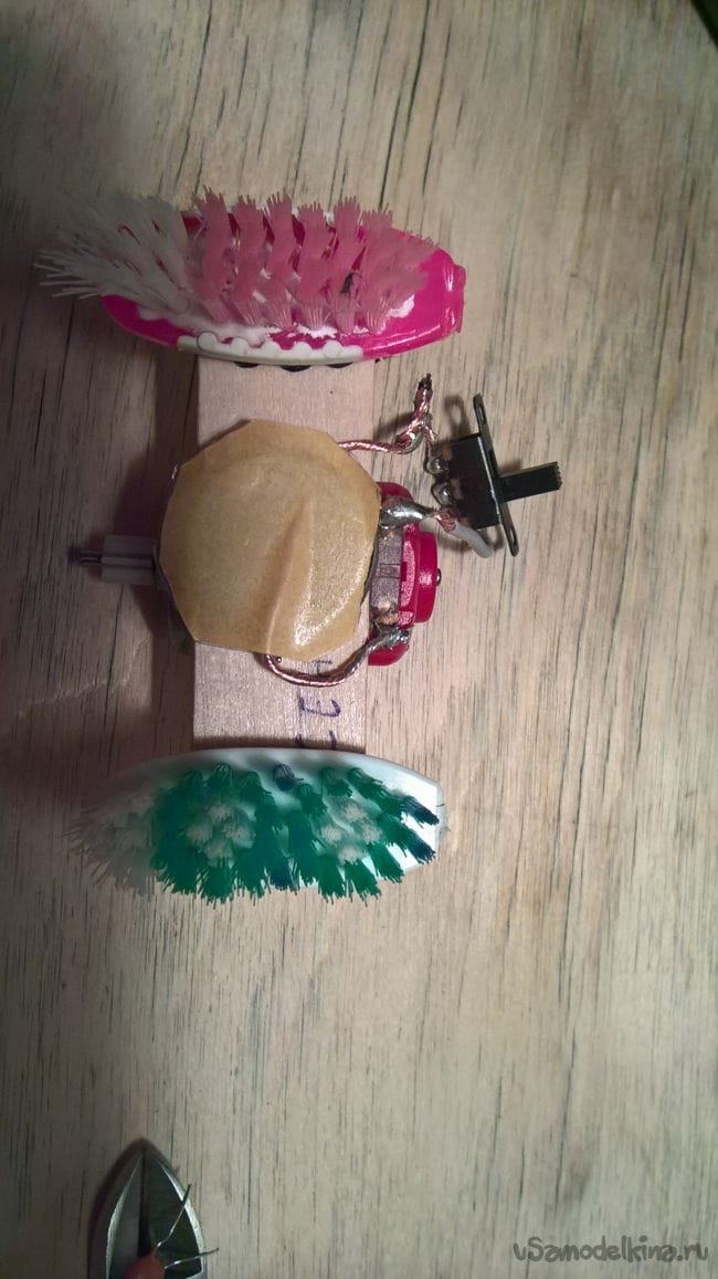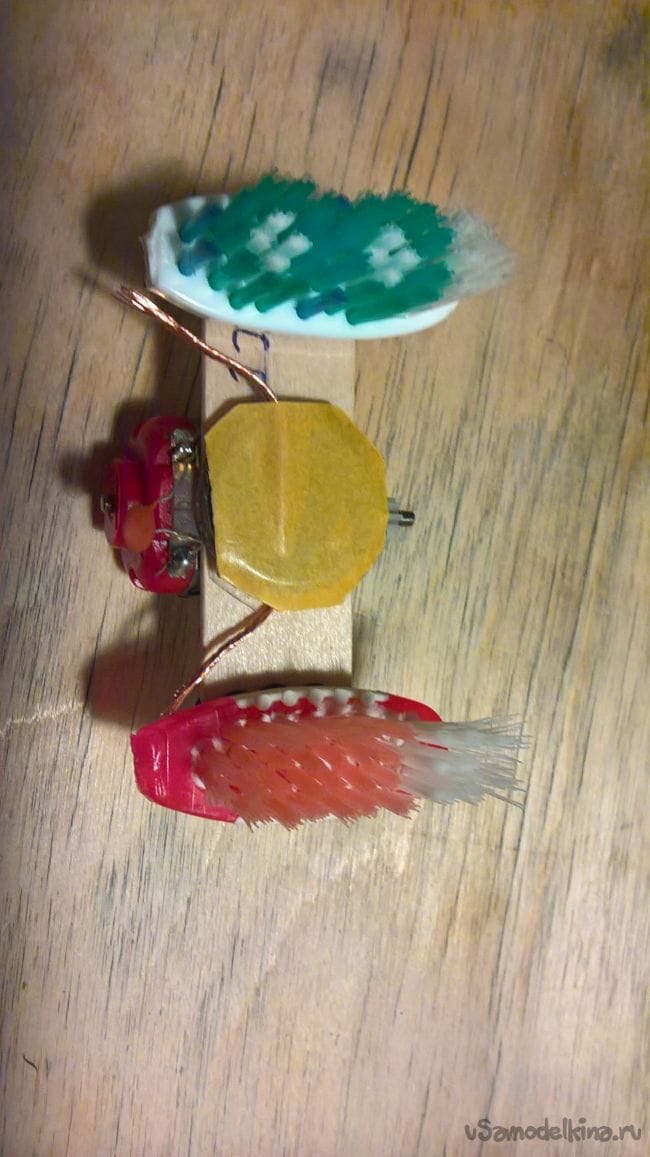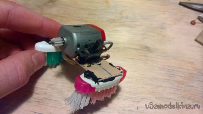 Теперь берем электро мотор и клеем его термо пистолетом к палочке с щетками