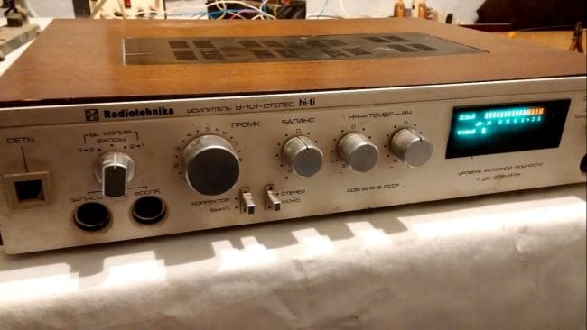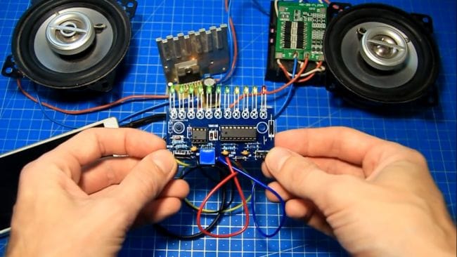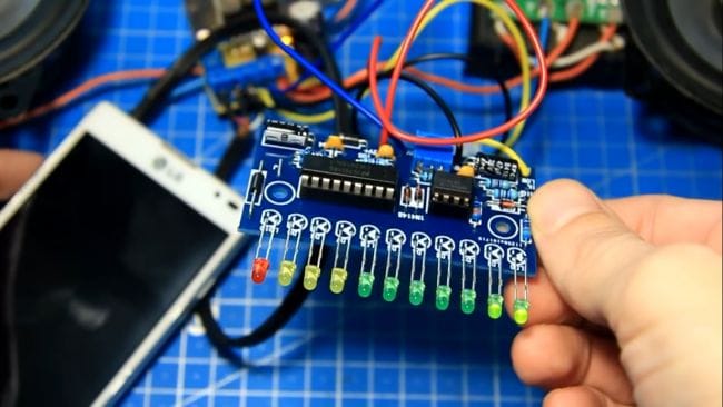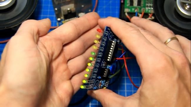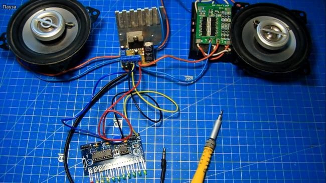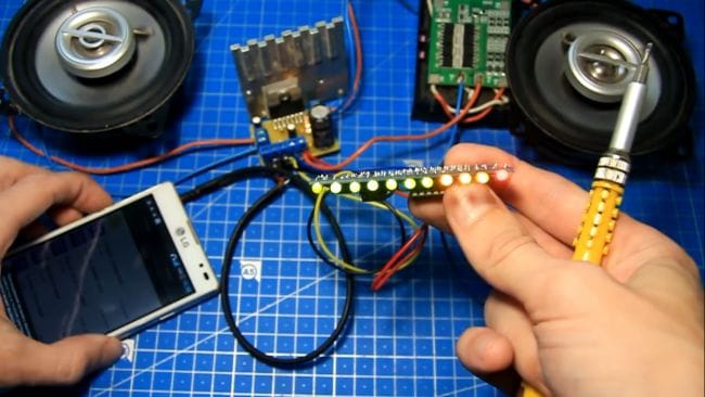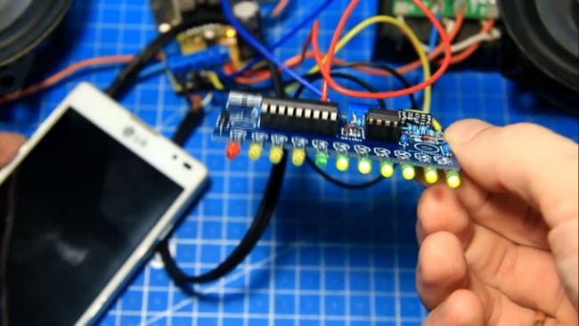 Также запитан и усилитель звука. Теперь попробуем подключить телефон и включить музыку. Давайте посмотрим на работу индикатора уровня сигнала.