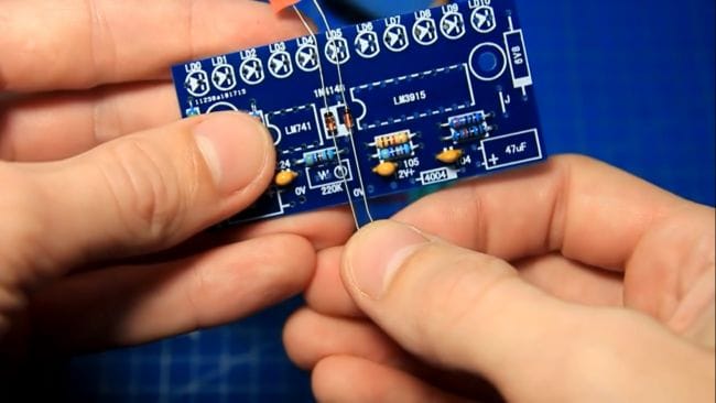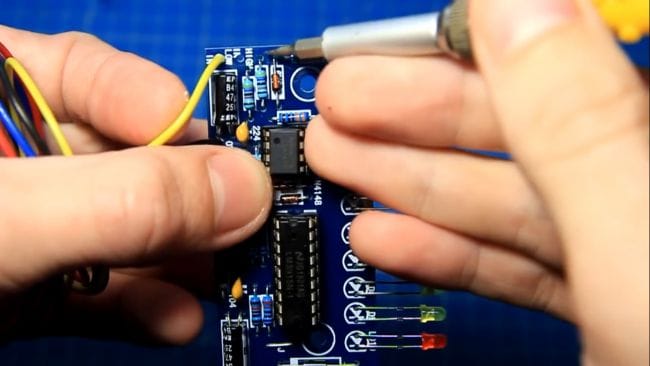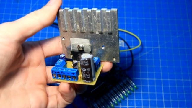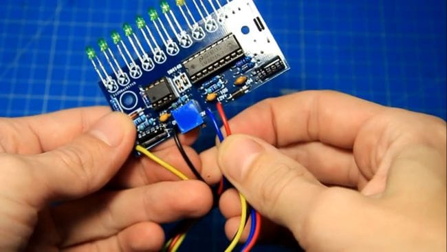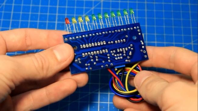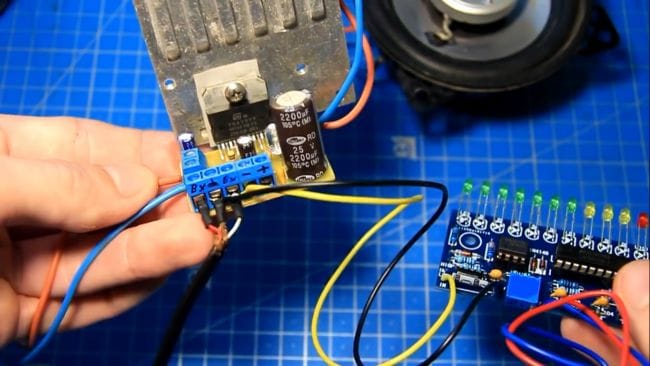 Желтый провод автор припаял к сигнальному звуковому проводу, а чёрный к общему проводу. Если плат две, то вторая аналогично подключается ко второму каналу. Для проведения тестов только что собранного светодиодного индикатора уровня звукового сигнала, автор решил использовать усилитель на микросхеме TDA70377 с питанием от 12В для удобства, чтобы показать, но можно взять и другой.