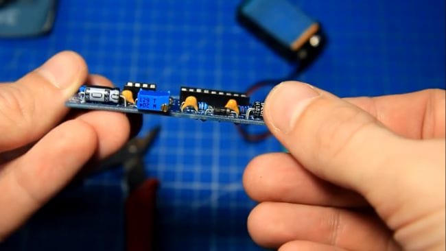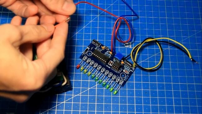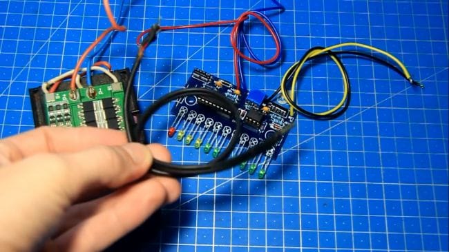 Еще автор допаял провода для подключения индикатора (красный и синий - плюс и минус питания, а желтый и черный – это вход для сигнала).