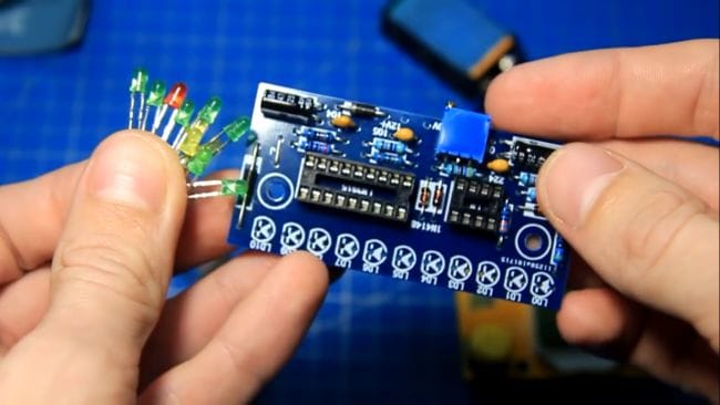 На плате есть место для установки 11-ти светодиодов. Более длинная ножка светодиода - это плюс. По рисунку или маркировке устанавливаем светодиод на плату. Десятый светодиод – красный.