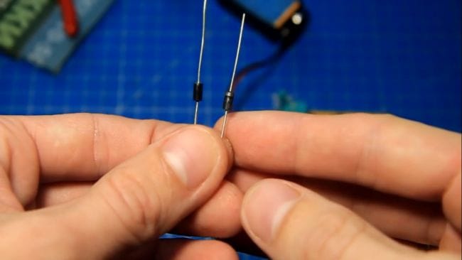 Смотрим маркировку и берем 2 диода. Находим их место на плате. Обязательно нужно соблюдать полярность, для этого есть метки на корпусе и плате.