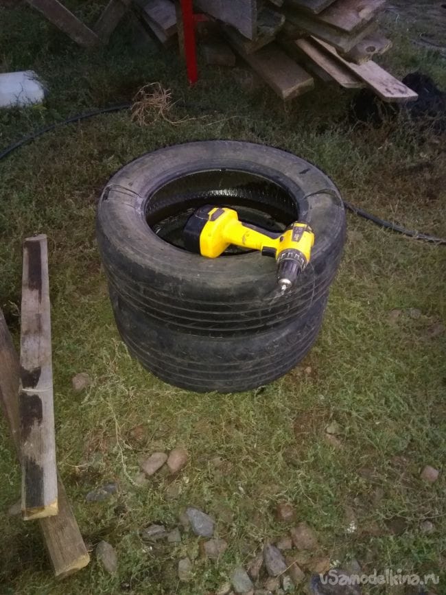 Затем, после того как покрышки высохнут, с помощью шуруповерта саморезами скрепляем 2 покрышки изнутри по корту,вполне достаточно будет 2-4 саморезов.