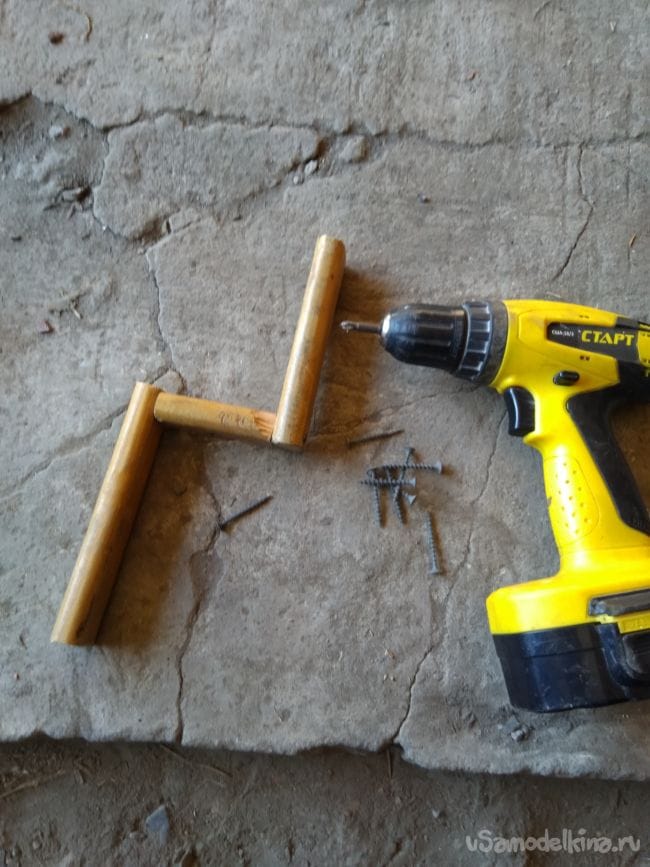 Далее оставшийся отрезок от планочку распелила на три неравные части и "слепила" вот такую крутилку!и закрепила саморезами вровень с перекладиной.