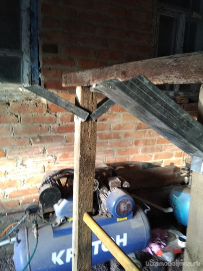 После нашла ещё такой же брус, длиной он был наверно приблизительно см 70. Положила на стойки и "присаморезила", это будет основанием для крыши.