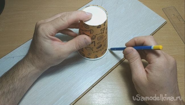 Края и наружный угол бумеранга чертил при помощи стаканчика для кофе, отмерив от центра одинаковое расстояние и поставив метки.В моем случае получилось по 19 см. от центра к краю.