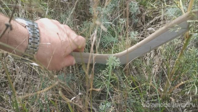После того как я его сделал мы поторопились с сыном на испытания. Около трех часов мы кидали этот бумеранг, он встревал в землю, стриг кусты, бился об деревья но выжил.
