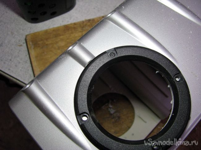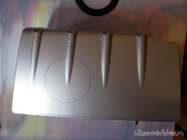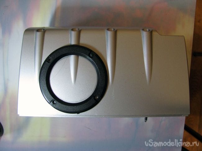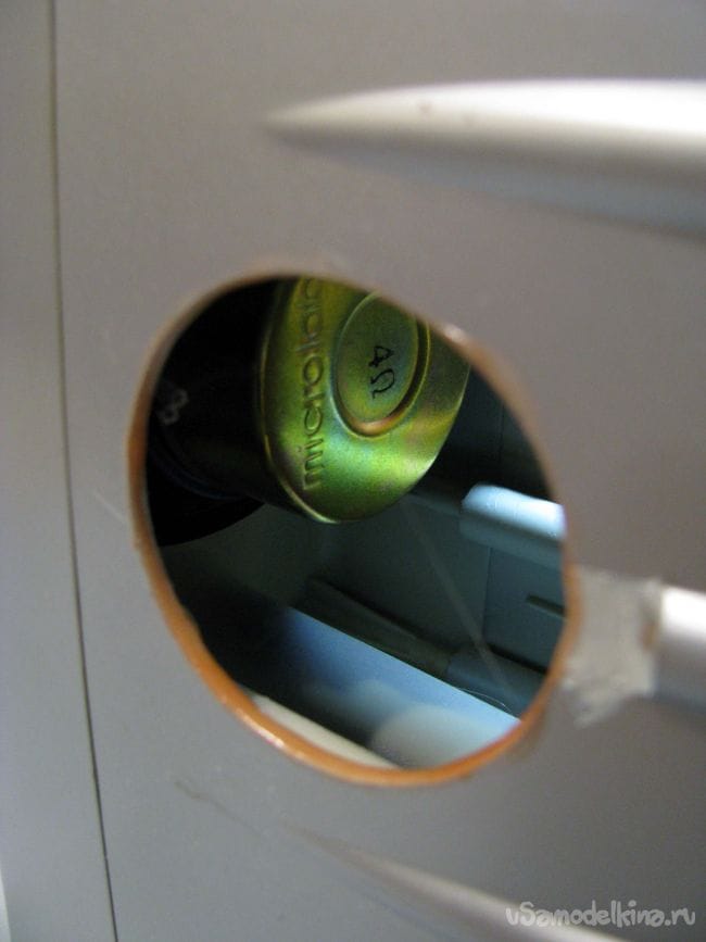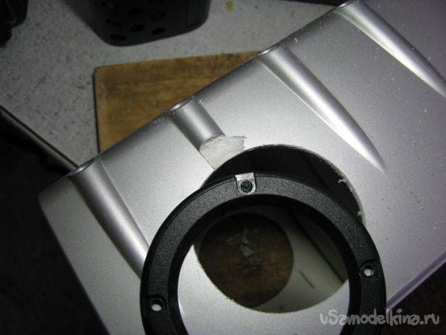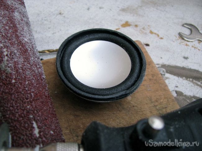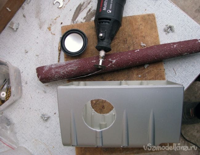 С обратной стороны, я таким же образом вырезал отверстие, взял динамик и крупнозернистой шкуркой свернутой в трубочку, быстро подогнал диаметр отверстия под внешний диаметр картонного предохранительного кольца динамика.