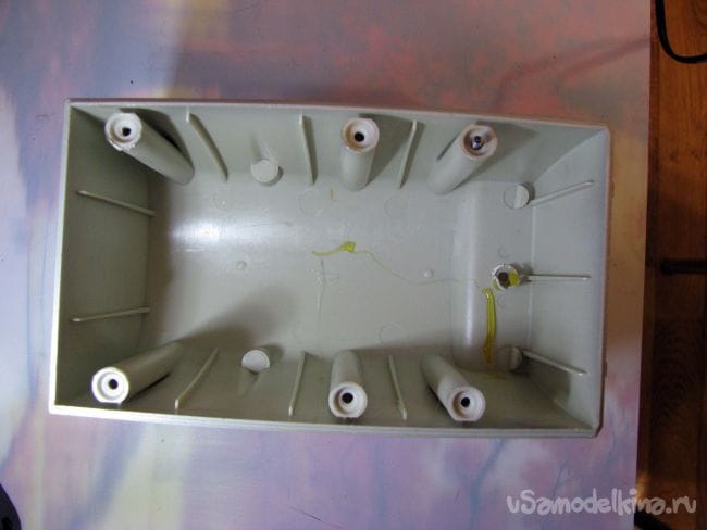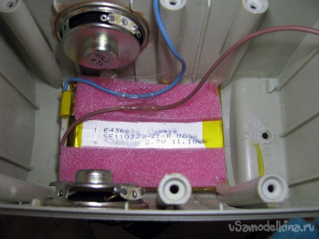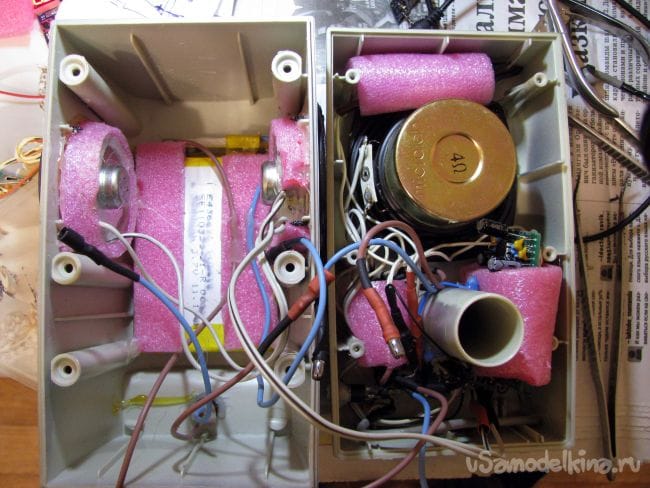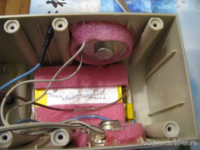 Сам аккумулятор удобно расположился на задней стенке колонки. Вначале, к аккумулятору я приклеил «Супер монолитом» полоски вспененного полиэтилена…