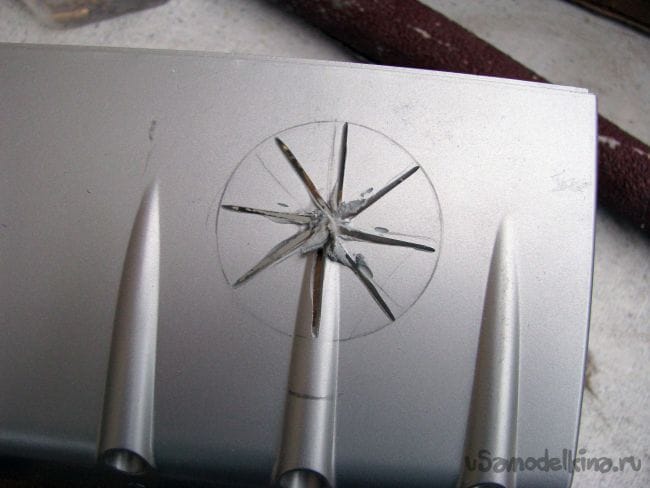 Отрезным диском, я сделал сразу несколько пропилов. Я обнаружил, что отрезать сектора при малой окружности отверстия, гораздо удобнее в плане боязни что руку поведет не туда.