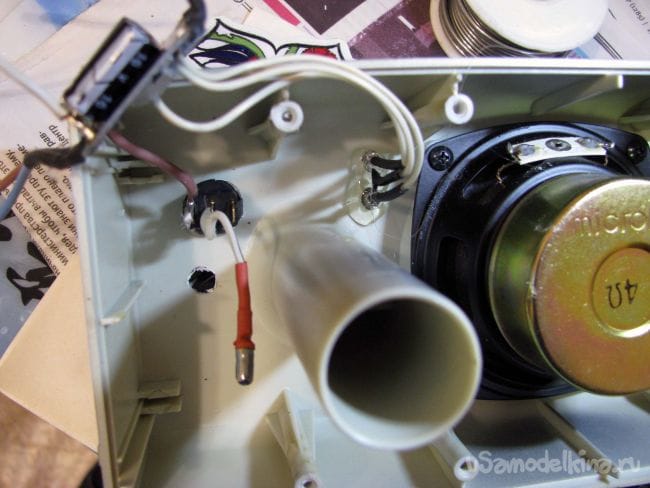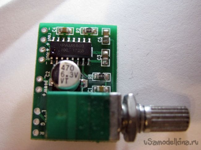 Ниже трубы фазоинвертора, разместился блочек усилителя мощности на PAM8403. Прямо к его входу питания, был так же припаян конденсатор емкость 1000мкф.