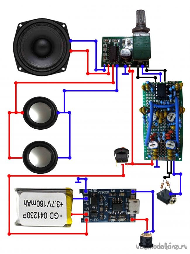 Единственное что замечу, - это обязательное применение конденсатора, емкостью 470мкф и помеченного звездочкой. Когда вся схема была собрана на столе, я подключил на время одолженный блютуз-свисток, я услышал сильные помехи. Не цифровое блимкание, а именно сильный шум, и тогда я вспомнил о статье, которую читал не так давно, ссылку на нее я дам в конце. В этой статье говорилось, что этот конденсатор, ослабляет влияние усиливаемых помех.