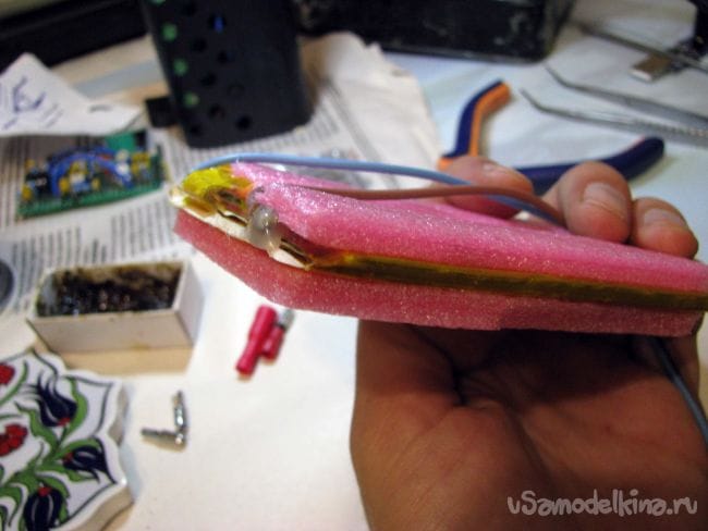 …а потом уже те полоски, зафиксировал каплями горячего термоклея, мне показалось плохой идеей лить горячую жижу прямо на аккумулятор.