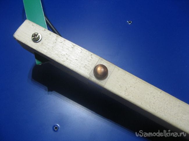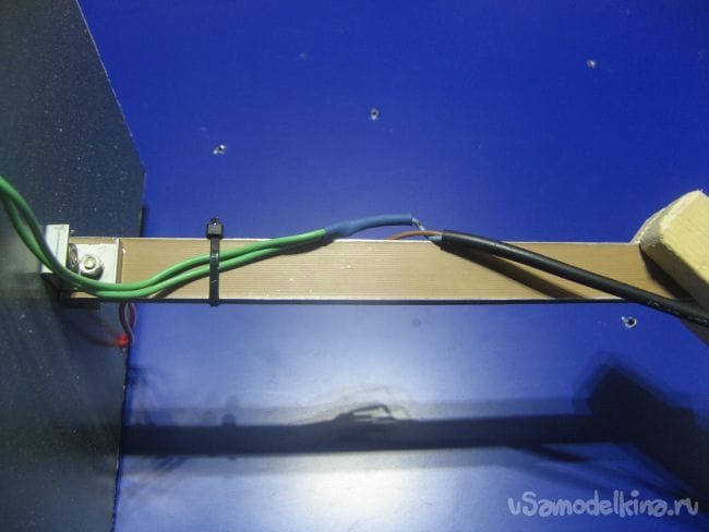 Провод на рейке закрепил, с помощью отрезка пластиковой бутылки и гвоздика с большой шляпкой.