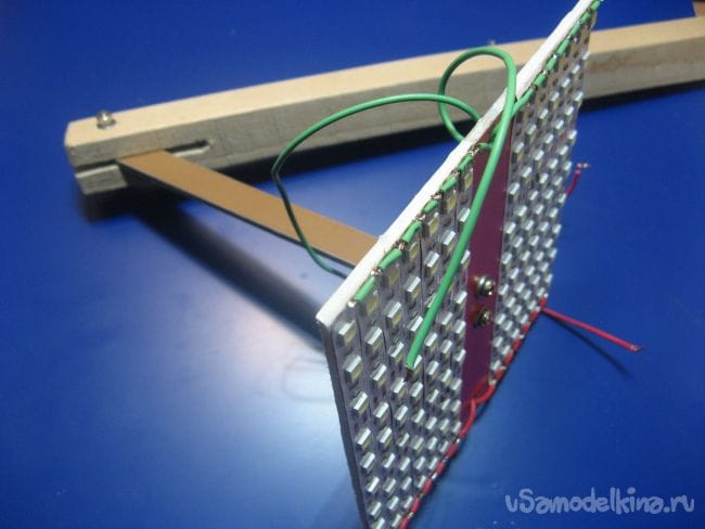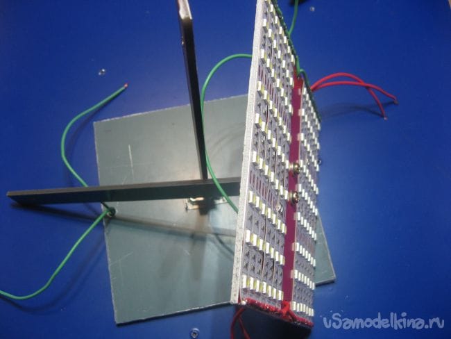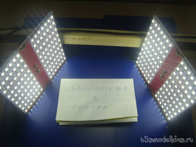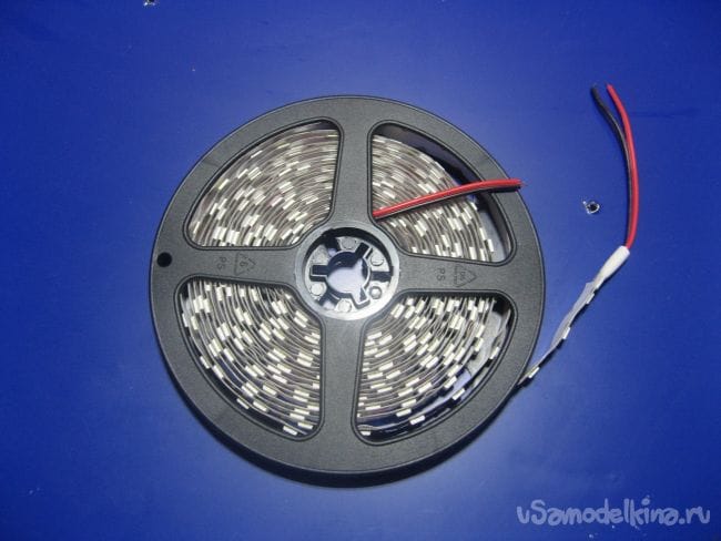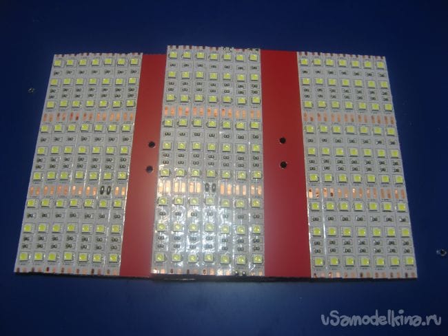 На пластины отражателя, нужно наклеить отрезки светодиодной ленты. Отрезки длиной по 150 мм каждый. На отрезке получается по 9 светодиодов.