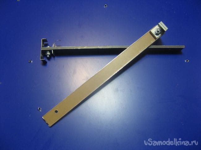 Стоики крепятся к рейке. Нужно разметить. Продеваем в прорез и сверлим сквозное отверстие под винт М4. Угол на который складывается стойка порядка 45 градусов. Достаточно чтоб компактно складывать отражатели со светодиодными лентами.