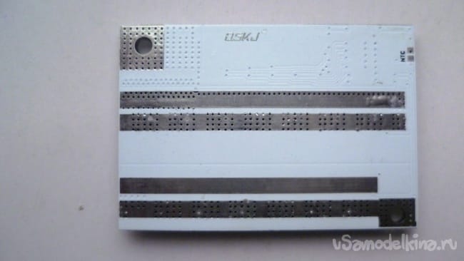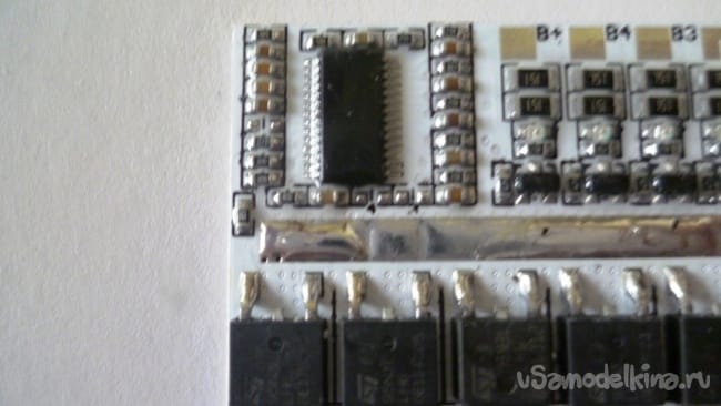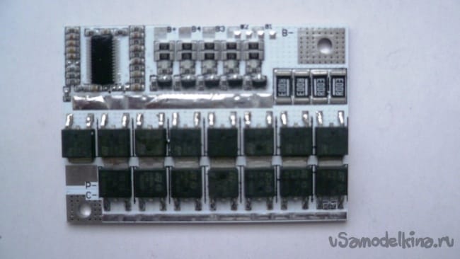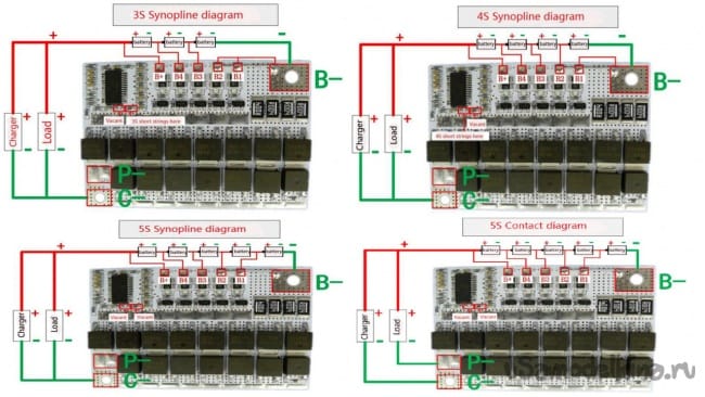 У микросхемы есть места запайки перемычек, обозначенные цифрами 4 и 3. По схеме 5S перемычки не устанавливаем. По схеме 4S перемычку припаиваем между контактами 4, ну а по схеме 3S припаиваем между контактами 3. Наиболее удобна схема с общим минусовым проводом на питание двигателя шуруповерта и зарядки аккумуляторов. Общий минус подключаем к площадке С-.