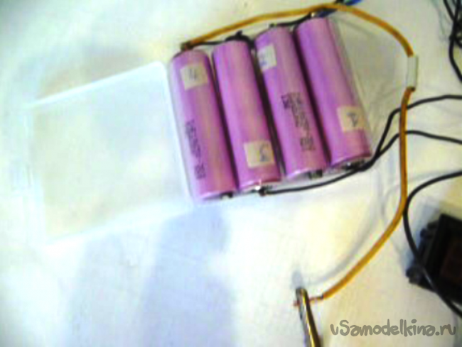 Литий –ионный аккумулятор 18650 смонтировал в пластмассовом боксе с перемычками(был в комплекте с аккумуляторами), к которым также припаяны провода управления балансировкой. Можно соединить аккумуляторы между собой при помощи пайки, но нужно быстро припаять провода исключая перегрев корпуса аккумулятора. Можно применить точечную сварку а можно использовать готовый холдер. Силовые выводы лучше сделать из гибкого медного провода сечением 1,5-2,5 кв.мм, так как токи на двигатель шуруповерта немаленькие.