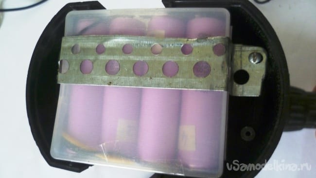 Плату контроллера BMS приклеил двухсторонним скотчем к пластмассовому аккумуляторному боксу. Вся эта конструкция плотно вошла в корпус старого аккумуляторного отсека. Чтобы не вывалилась закрепил металлической полоской. Нижняя крышка аккумуляторного отсека была давно утеряна-позже надо будет сделать самодельную.