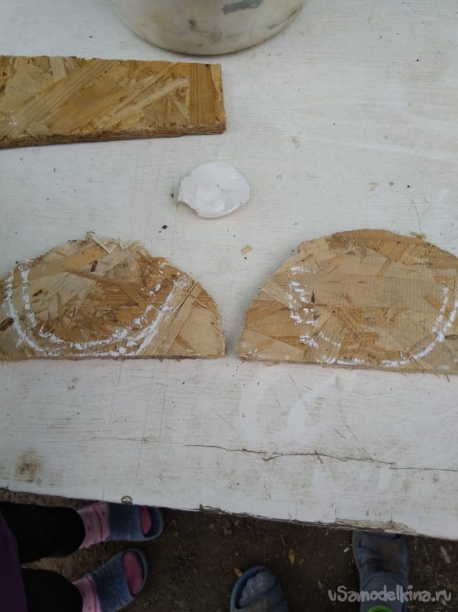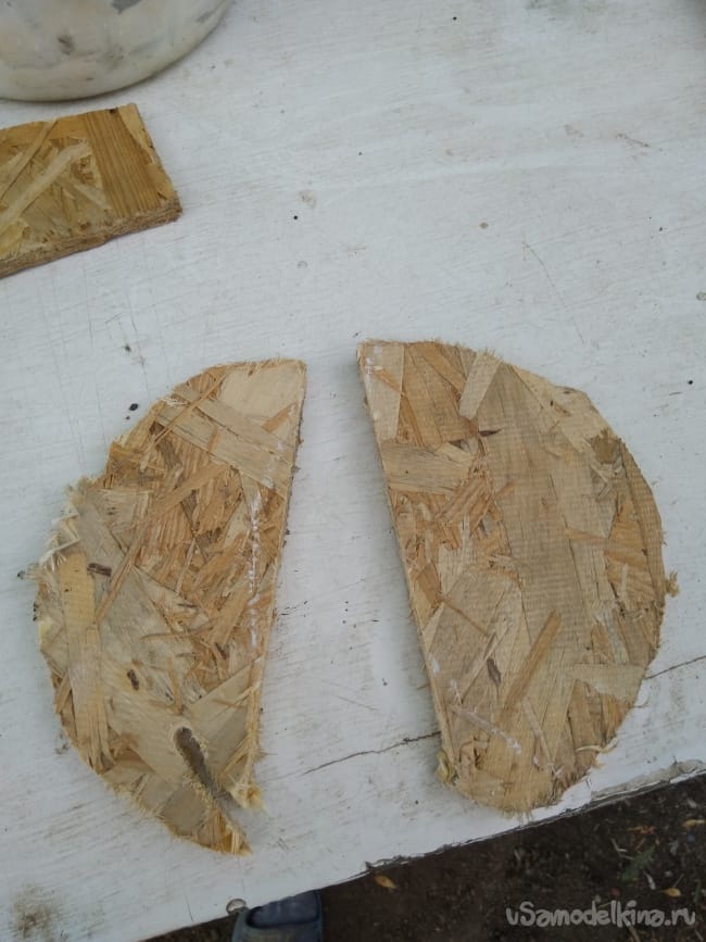 Затем берём кусок доски и пилой распиливаем на 2 равные части. У меня один из кусков был круглый.