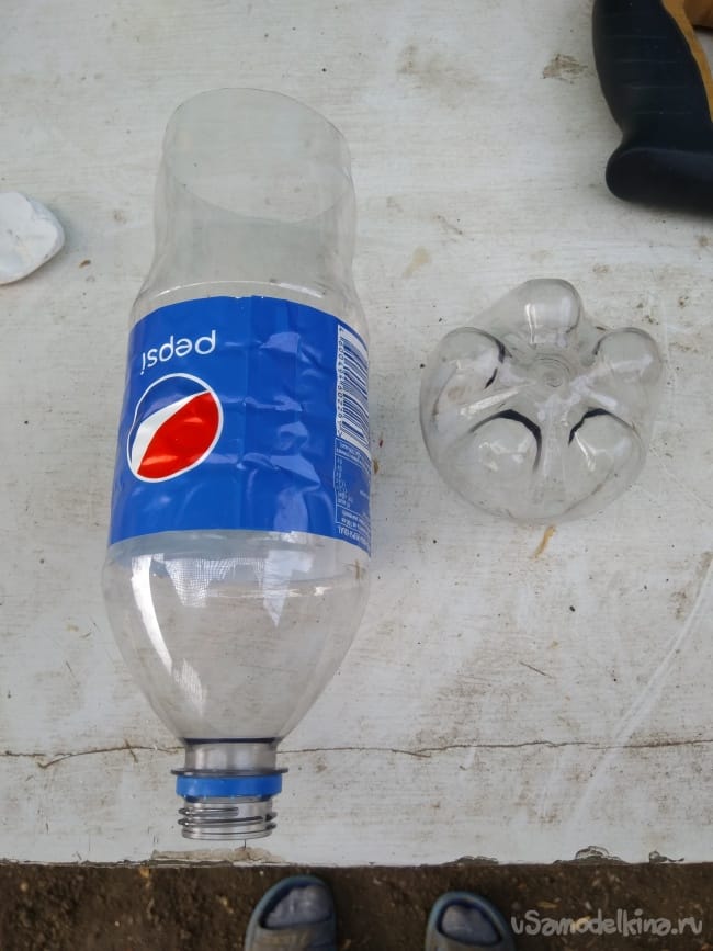 Берём пластиковую бутылку и канцелярский ножом отрезаем донышко.