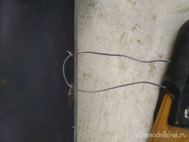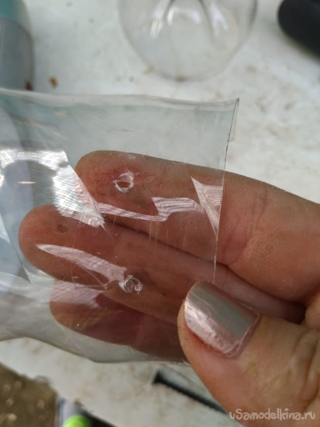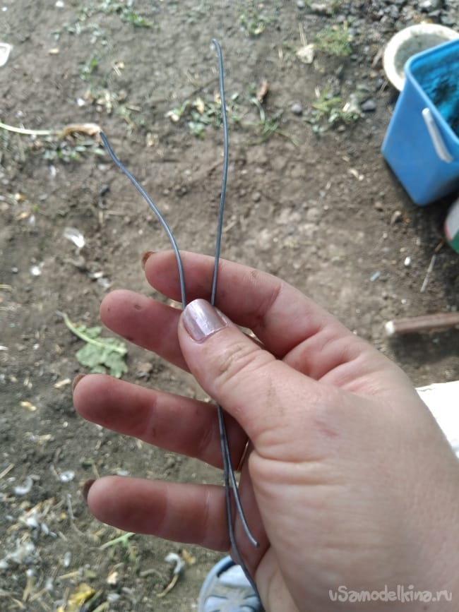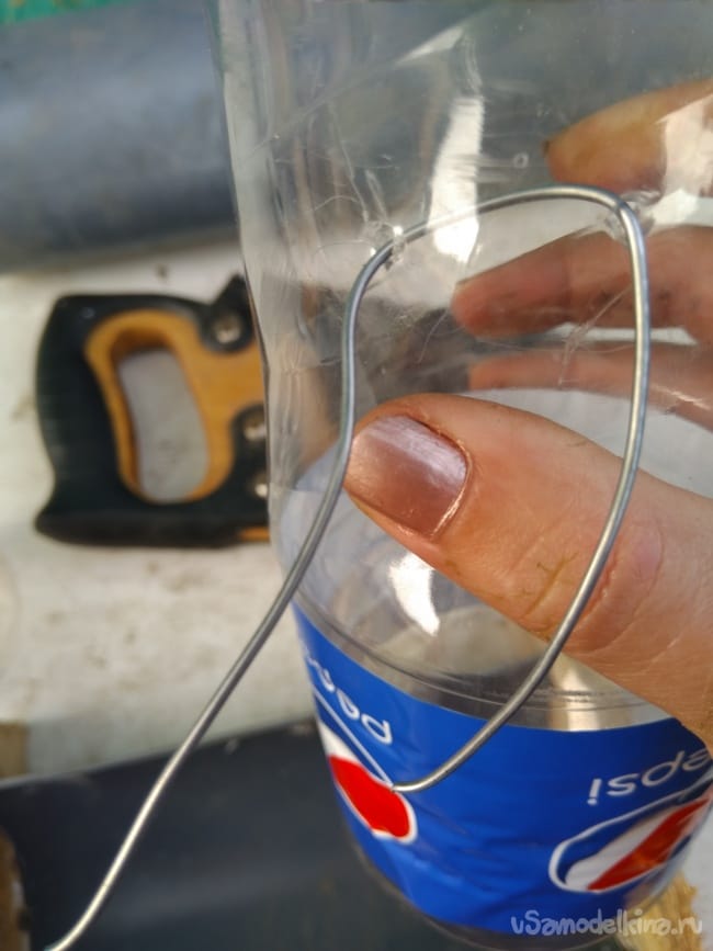 Затем проделываем два отверстия в бутылке, берём небольшой отрезок проволоки и продлеваем в дырочки.