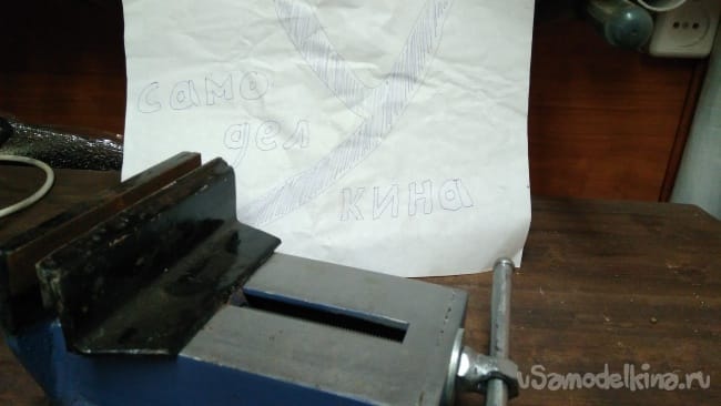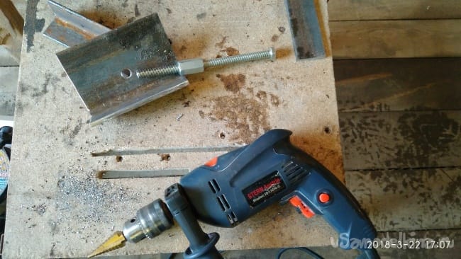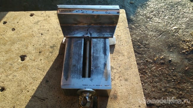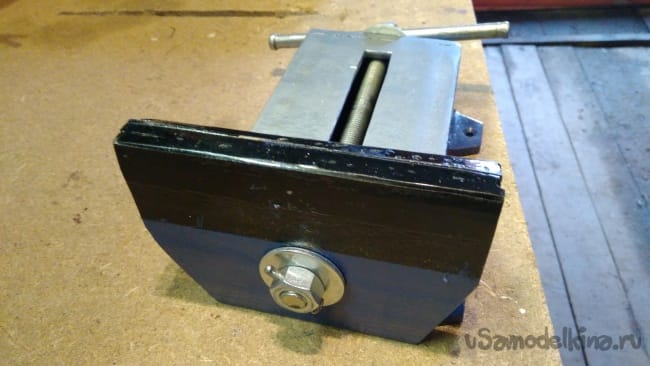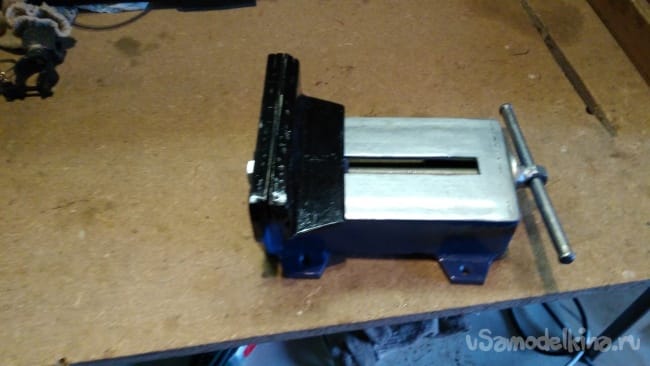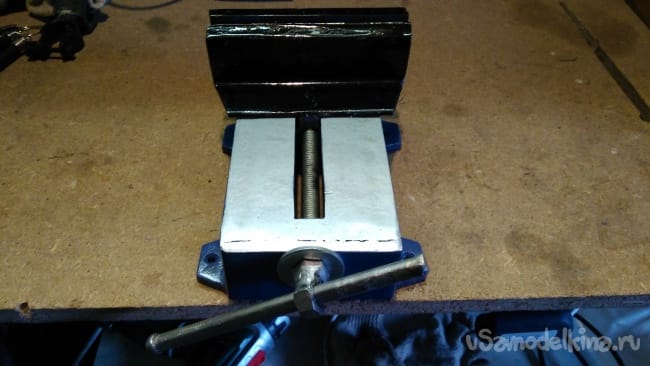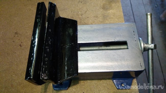 В ножках тисков сверлю отверстия для крепления тисков саморезами к столу.