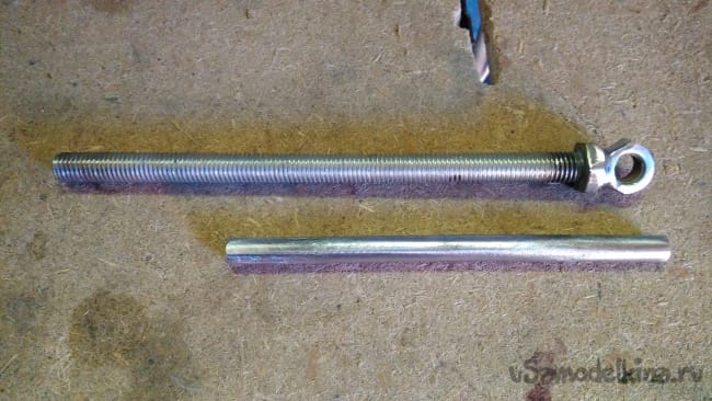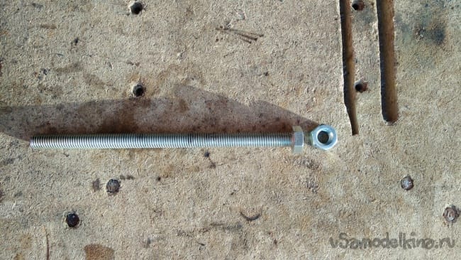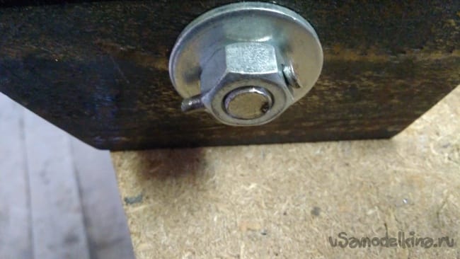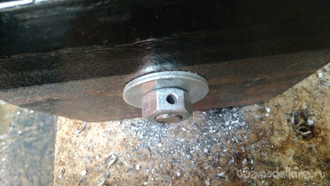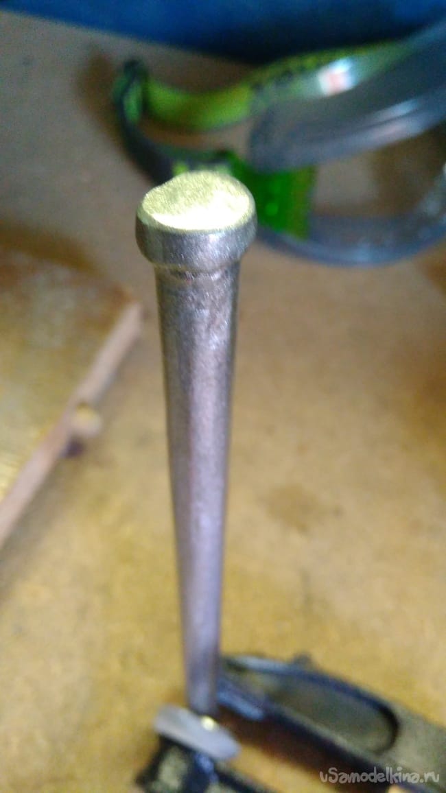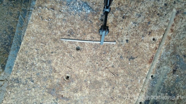 В гайке с болтом сверлю отверстие и вставляю гвоздь.