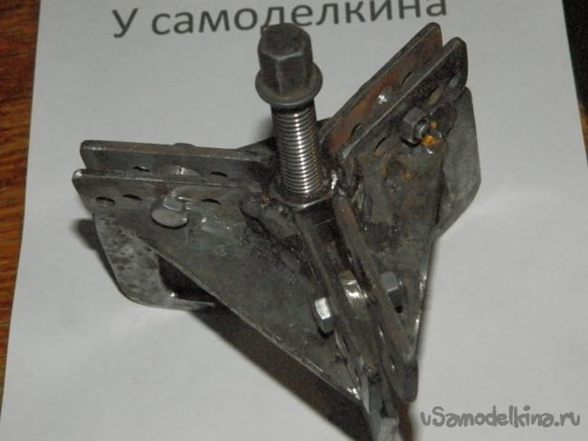 Шаг 5 наворачиваем гайки на 12мм на болт и свариваем их вместе, привариваем к треугольной пластине и выкручиваем болт. Затем стягиваем попарно пластины гайками на 6 мм положив между ними прокладку и привариваем их так чтобы прорезь была между пластин. Теперь зачищаем их при помощи болгарки. Прогоняем резьбу метчиком.