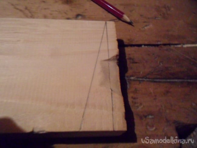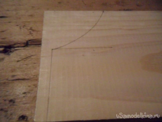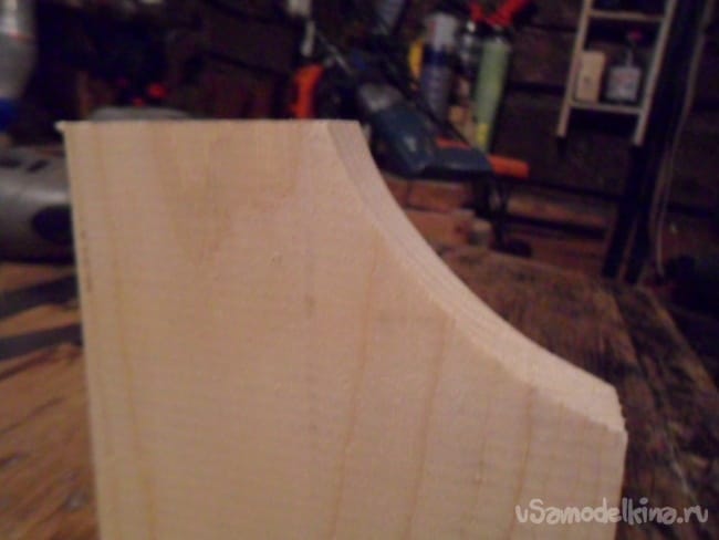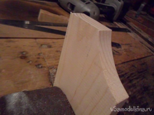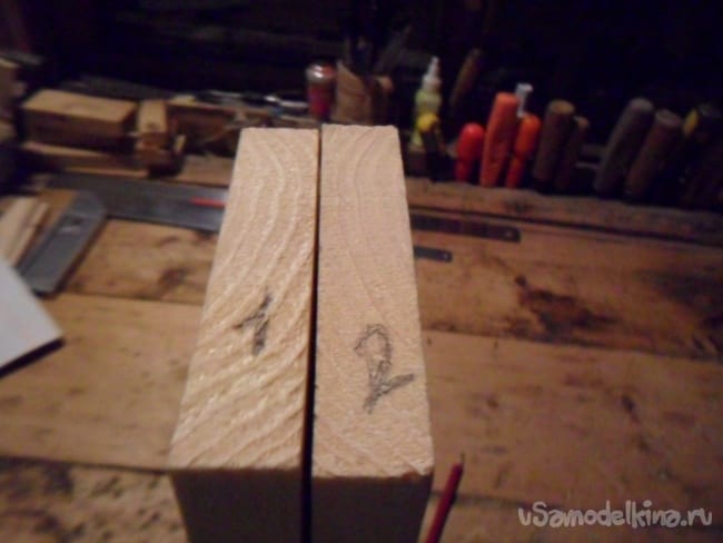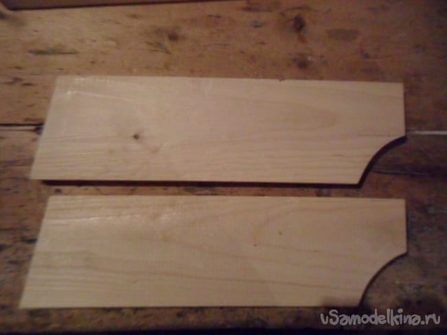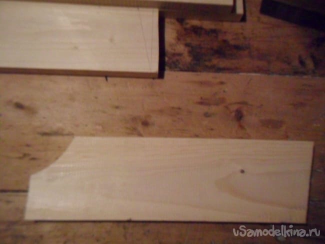 Далее рассматриваем вертикальные боковины и выбираем их взаимное расположение, в котором они будут находиться уже закрепленными с горизонтальными частями. Помечаем цифрами, чтобы лучше было ориентироваться. Верхние передние углы стоек будут скошенными, но по дуге, концы которой находятся в квадрате 4 х 4 см. Нижние торцы боковин также будут неперпендикулярными к кромкам стоек (ширина раскоса равна 2 см). Электролобзиком отпиливаем лишние очерченные части.