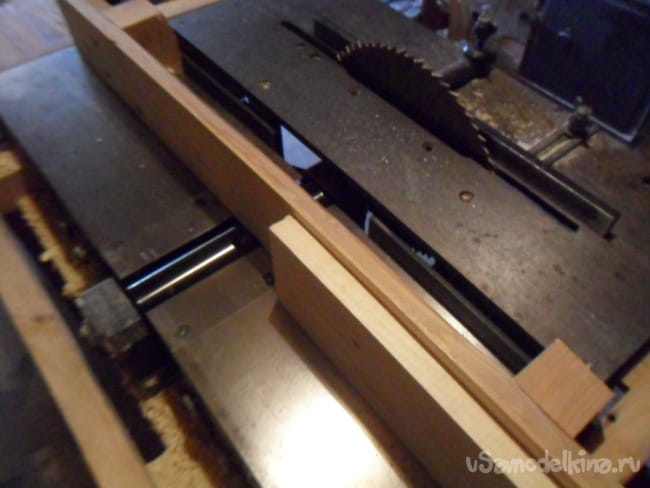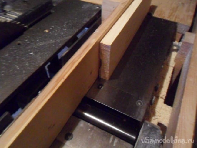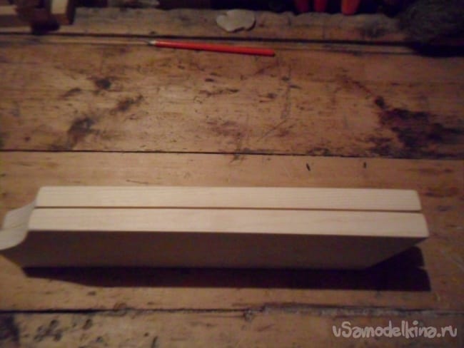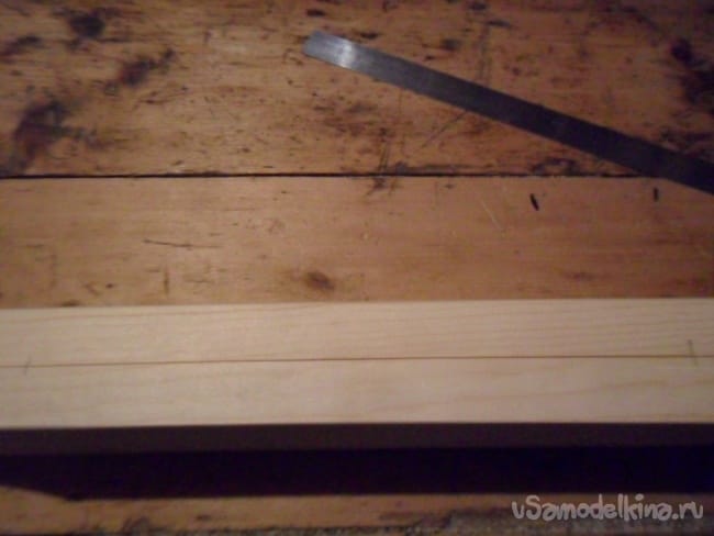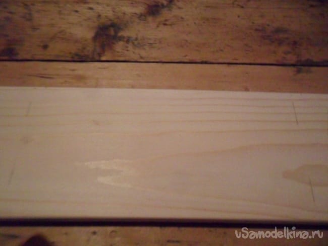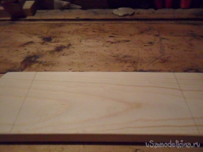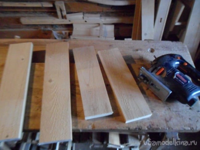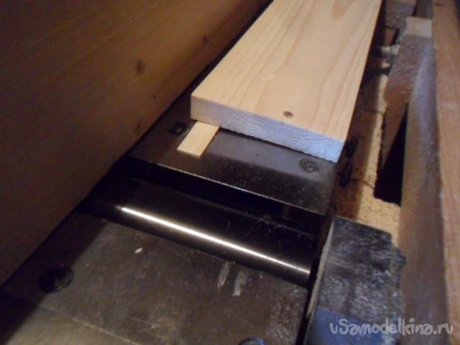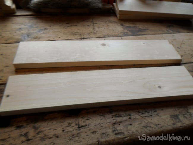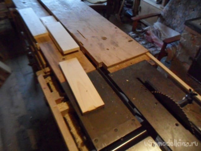 Начинаем работу с выбора подходящих досок. Боковины и внутренние несущие будут длиной 33 см и 43 см соответственно, поэтому отпиливаем электрическим лобзиком от досок нужные нам четыре части: 2 х 36 см и 2 х 46 см. Строгаем заготовки со всех сторон на циркулярно-фуговальном станке. Две самые большие грани (пласти) не параллельны друг другу. Чтобы исправить это, подкладываем под доску с краю тонкую рейку (до 5 мм) и ведем по плоскости станка. Кромку доски обрабатываем, прижав пластью к перпендикулярно установленному к плоскости рабочей поверхности станка упору.
