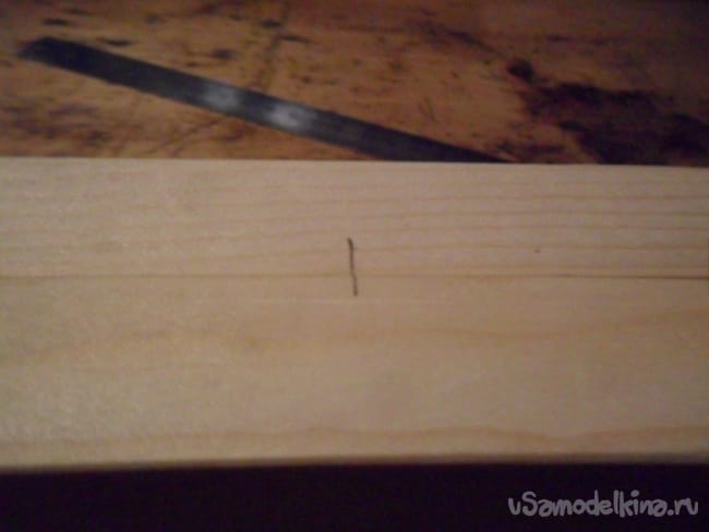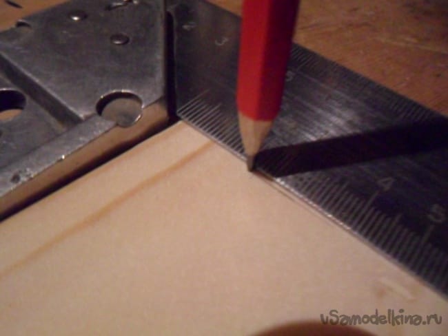Теперь следует отметить места, куда будут вкручиваться саморезы для соединения всех частей будущей полки. Приставив боковины друг к другу, отмечаем, где будут располагаться горизонтальные несущие полки (расстояние между отметками получилось равным 19 см). Затем продолжаем перпендикулярно эти линии: на внутреннюю сторону – через всю ширину пласти, на внешнюю – частично, примерно по 1,5 см, так, чтобы штрихи находились на расстоянии не более двух сантиметров от кромок доски. Приставив угольник, карандашом отмечаем те места, где будут находиться саморезы (метка остается напротив 2 см). Так как сверло использовалось по металлу, то для более точного сверления шилом «утапливаем» точки.
