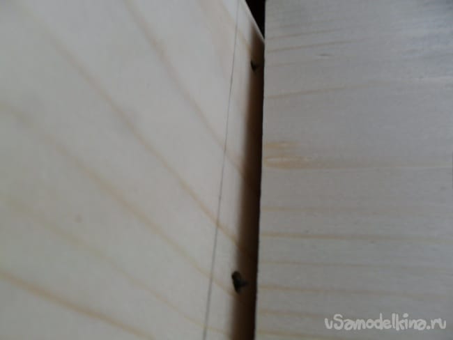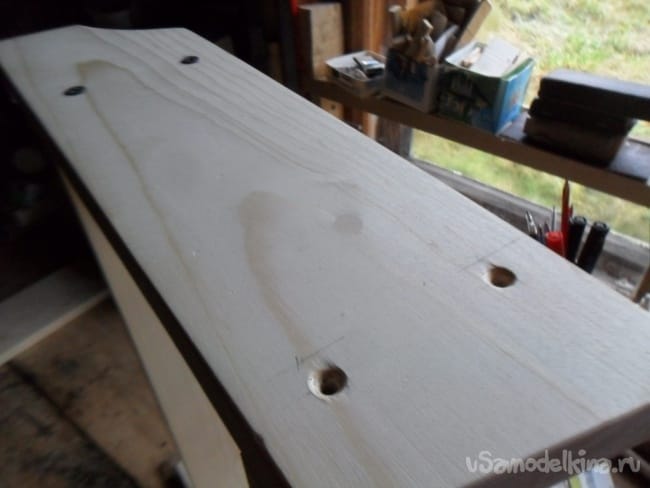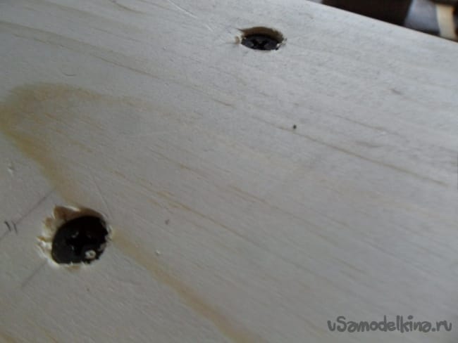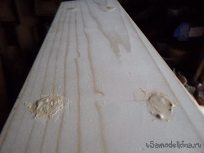 Изначально саморезы планировалось оставить в боковинах. Но по ходу работы решено было саморезы также – оставить, но скрытыми под небольшим слоем шпатлевки. Для этого разобрал полку, просверлил отверстия под шляпку саморезов (углубления получились не совсем круглыми, т. к. острие сверла не было зафиксировано в дереве), отшлифовал доски. Потом, промазав торцы столярным клеем, соединил горизонтальные несущие детали с боковинами и вкрутил плотно саморезы в прежние места. Далее положил в углубления небольшие массы шпатлевки (должны получиться горбики вязкого вещества, которые в дальнейшем усохнут и будут располагаться не ниже уровня плоскости доски). Теперь нужно дать шпатлевке высохнуть пару часов.