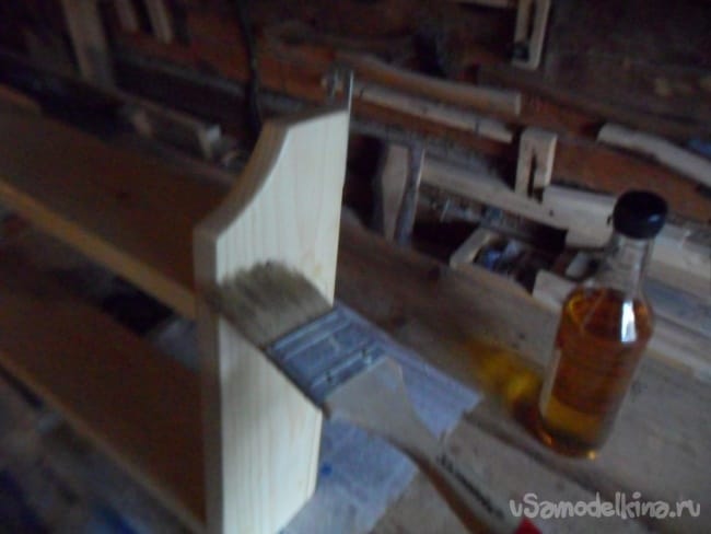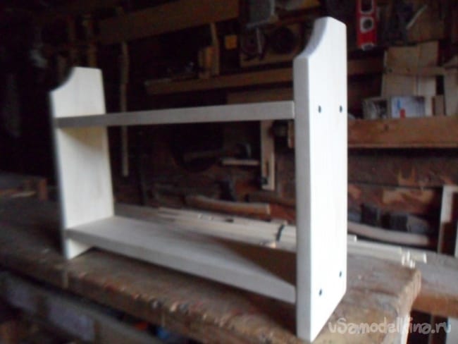 Для покраски использовался бесцветный лак. После его высыхания полку рекомендуется легко обработать мелкозернистой наждачной бумагой или другим шлифующим материалом, чтобы убрать образовавшиеся неровности, волны. И покрасить еще на один слой. Процесс создания полки удачно завершен.