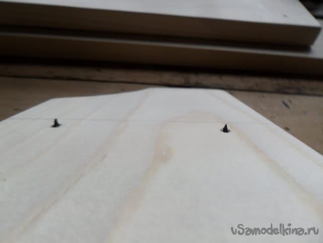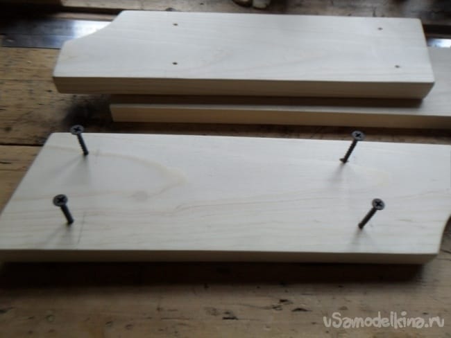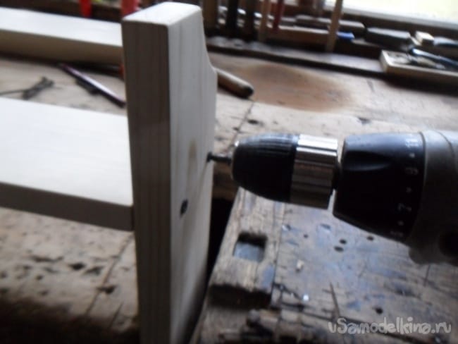 Вкручиваем саморезы в отверстия так, чтобы острые концы слегка выступали из противоположной стороны доски. Далее: приставив верхний край торцов полок к черте, опускаем в необходимое положение весь торец - тем самым мы наметили места на торцах досок, куда впоследствии вкрутятся саморезы. Прижав плотно боковину, закручиваем шуруповертом саморезы. Проделываем всю вышеописанную операцию четыре раза. Таким образом собрали полку.