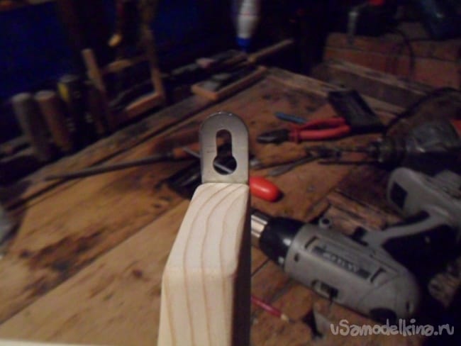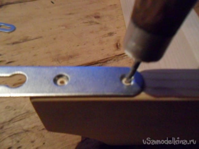 После высыхания шпатлевки шлифуем вертикальные стойки полки. Устанавливаем навесы, предварительно просверлив заводские отверстия на бо́льшую ширину, чтобы саморезы, держащие навесы, не выступали за пределы плоскостей последних.